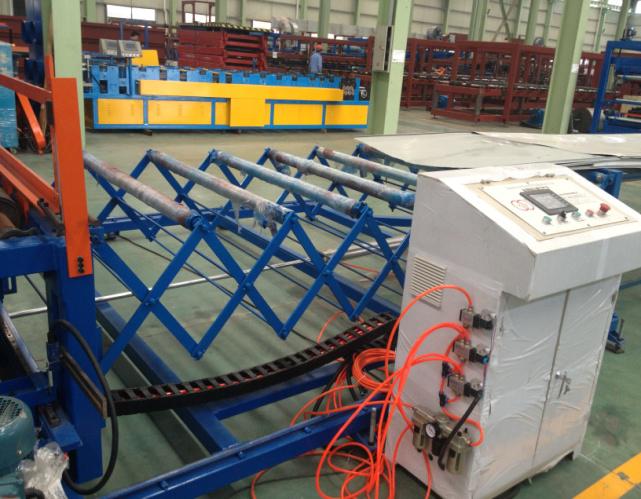 主要由瓦楞板壓型機(jī)和彩鋼復(fù)合機(jī)組成,可以一次性制做墻面彩鋼夾芯板或屋面彩鋼夾芯板,并且瓦楞板壓型機(jī)和復(fù)合機(jī)可以獨(dú)立生產(chǎn)。整條流水線壓型部分由彩鋼板開卷機(jī)、冷彎成型主機(jī)、切斷裝置組成,復(fù)合機(jī)部分由彩鋼板開卷,EPS板或巖棉板輸送,墻面淺波峰壓制,混合涂膠、加溫加壓、復(fù)合、平板卷邊、企口板翻邊、開槽、整邊、氣動(dòng)夾緊、自動(dòng)覆膜、自動(dòng)切割、成品拖架組成;